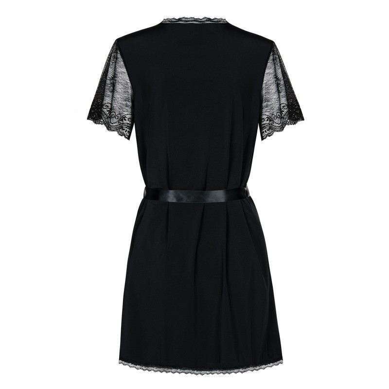 Très beau peignoir déshabillé avec une rare élégance. Ce peignoir sexy se portera en sortie de douche comme en surprise pour votre partenaire qui prendra beaucoup de plaisir à dénouer la ceinture de satin. Ce peignoir noir d'un tissu agréable est orné d'une petite dentelle qui s'accorde magnifiquement avec ces manches courtes en fine dentelle. La composition de ce peignoir satiné de la marque Obsessive et disponible en grande taille est composé de 85% polyamide 15% elasthane. Un joli string est fourni avec ce modèle.
