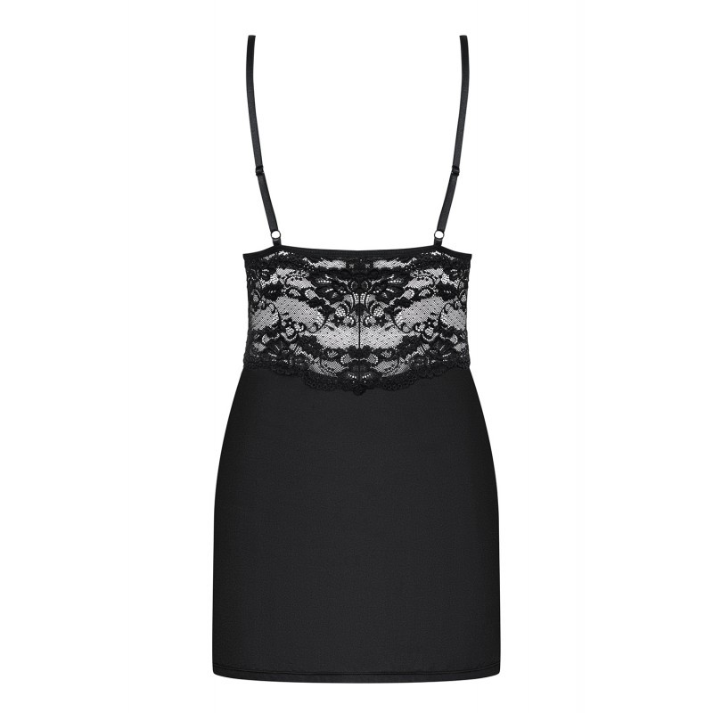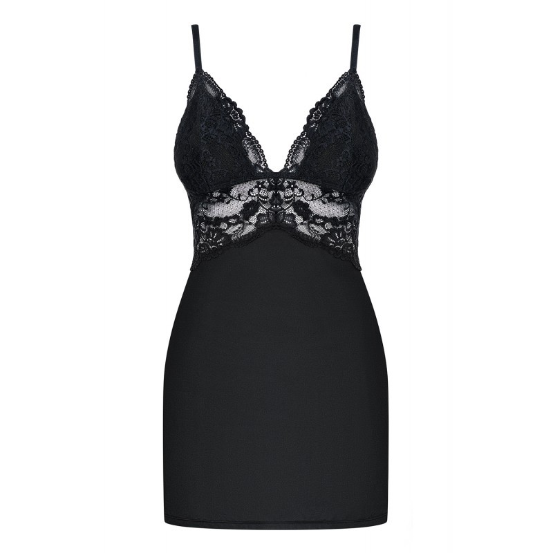 La silhouette est accentuée au niveau des hanches par une ceinture en dentelle noire décorant le tour de la poitrine, remontant jusqu'aux bretelles. Un décolleté bordé de dentelle vient sublimer le reste de la nuisette... Les bonnets sans armatures sont doublés et rembourrés pour mettre en beauté la poitrine sans aucune autre fioriture. Un string noir est inclus.