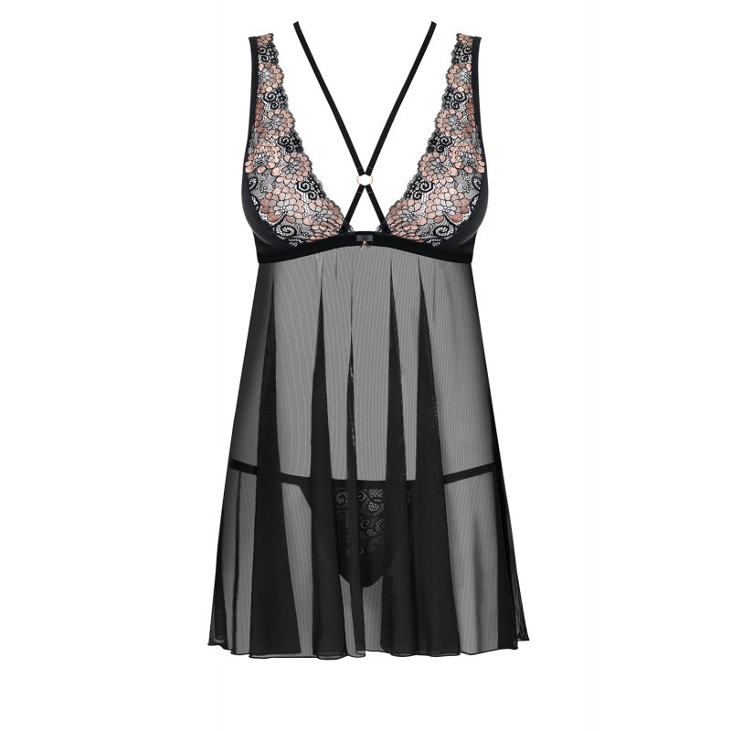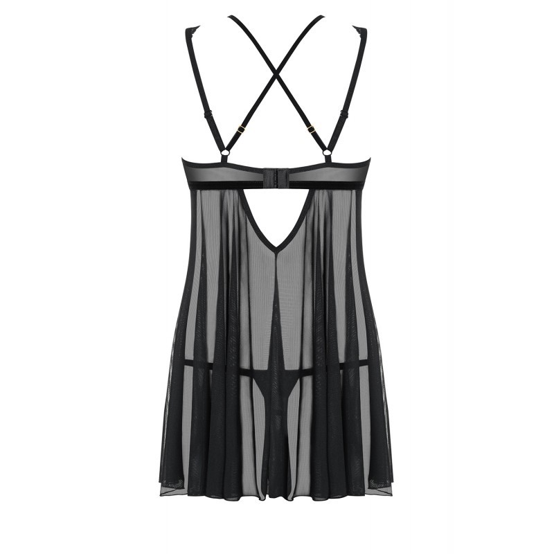 Cherchez-vous de l'originalité ? Vous en trouverez dans ce babydoll de la collection 873, qui marie une fine maille noire et une dentelle florale jouant sur les nuances de noir et doré. Pour mettre en valeur votre poitrine, une double lanière partant du dos se rejoint entre les seins en un bijou doré (sans nickel). Vous brillerez de mille feux !
