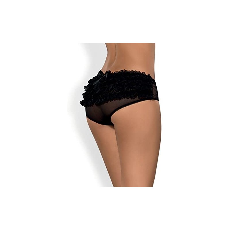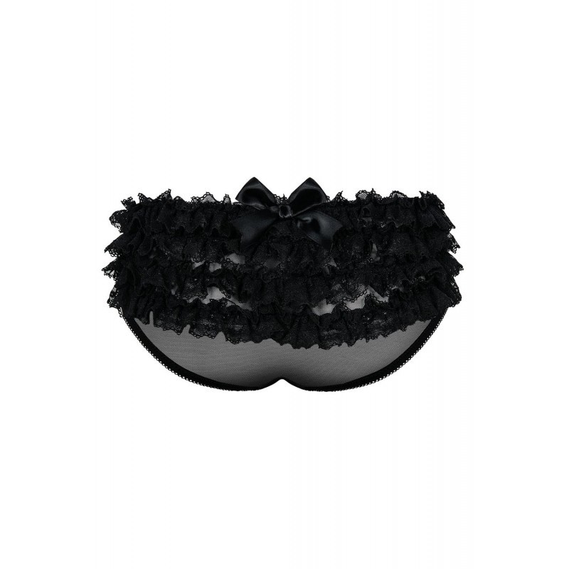 Une sublime touche féminine à porter, la culotte panty Frillita est confectionnée dans une alliance de voile noir et de dentelle florale recouvrant l'avant. Sur l'arrière, les fesses sont recouvertes de plusieurs rangées de froufrou surmontées d'un noeud satiné, de quoi attirer le regard.