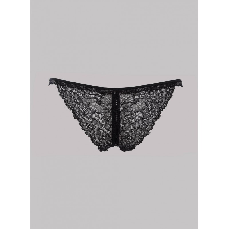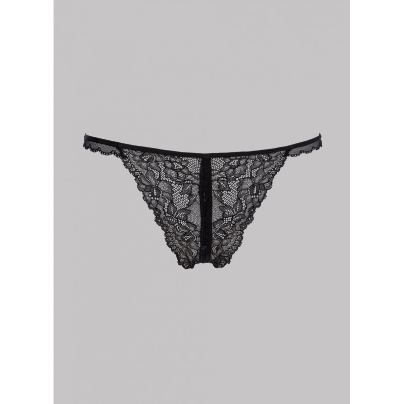 Confectionnée toute en dentelle, cette culotte de forme tanga classique peut s'ouvrir entièrement grâce à ses boutons habilement placés.