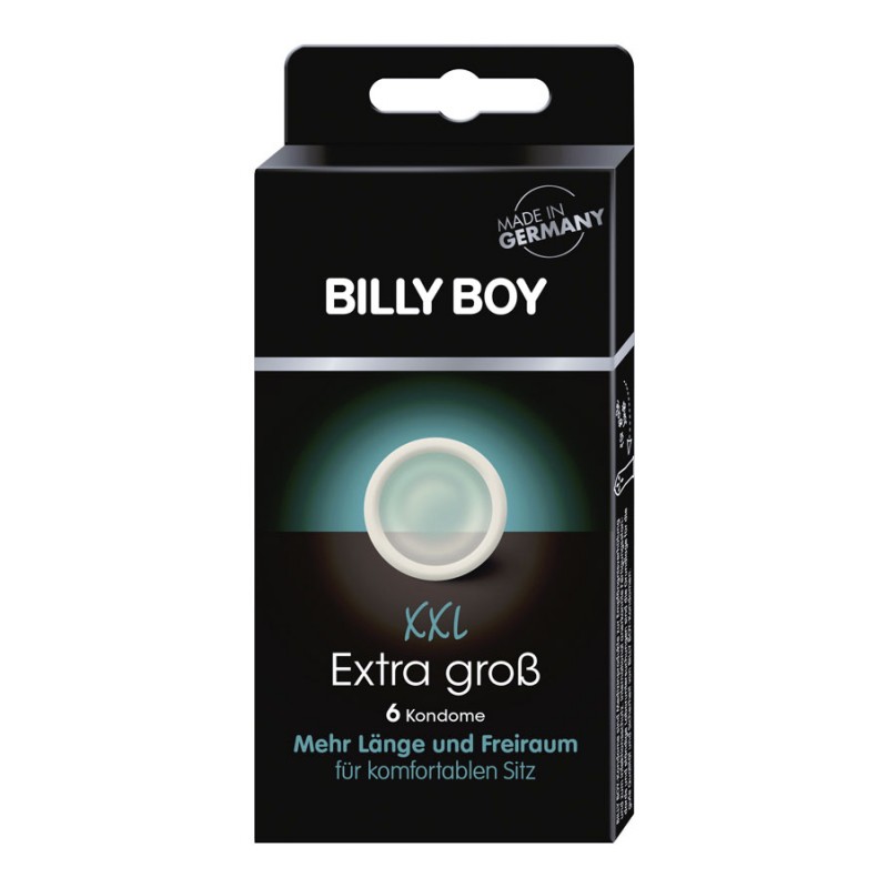 BILLY BOY Extra Large 6 pièces • 6 préservatifs XXL transparents • Longueur de 195 mm • Largeur de 62 mm dans la zone supérieure • Coupe confortable • Forme lisse • Lubrifié