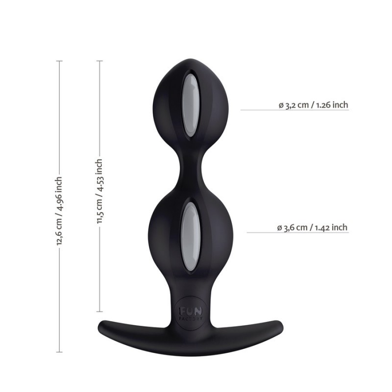 Les B-BALLS DUO sont un jouet anal très excitant pour elle et pour lui! Les deux boules s'introduisent sensuellement et délicatement comme les éléments d'une chaîne anale. A chaque mouvement, les billes en rotation situées à l'intérieur des B-BALLS DUO oscillent et excitent de façon douce ou plus intense, selon l'intensité de l'activité physique et corporelle.